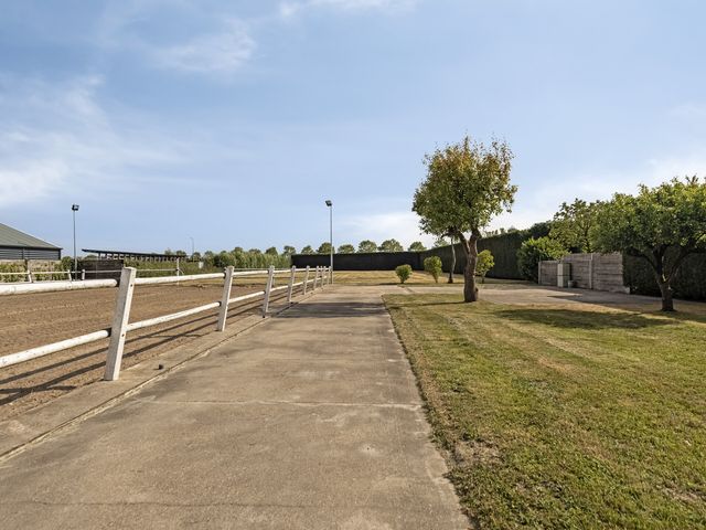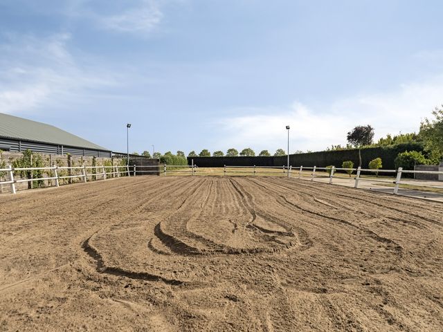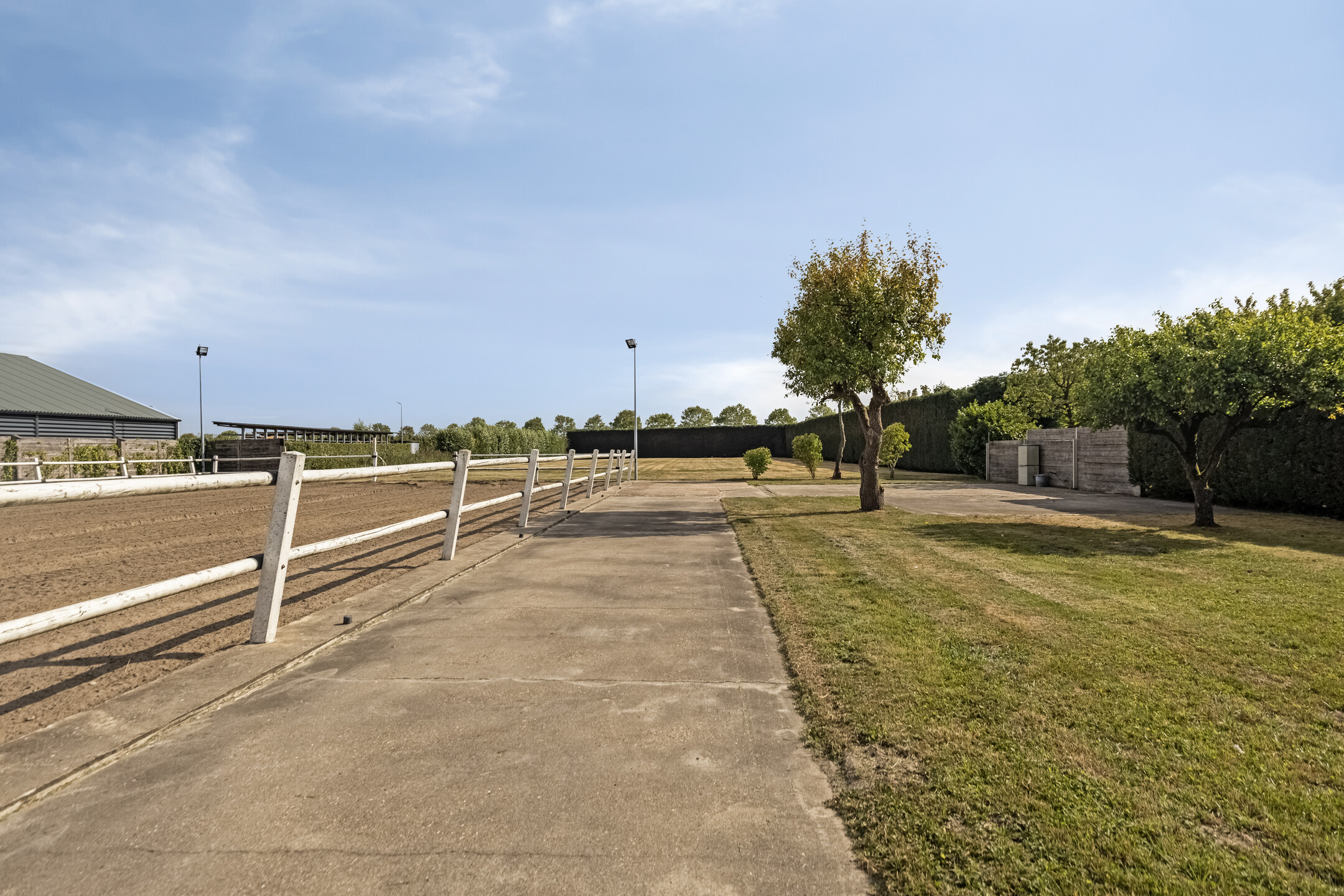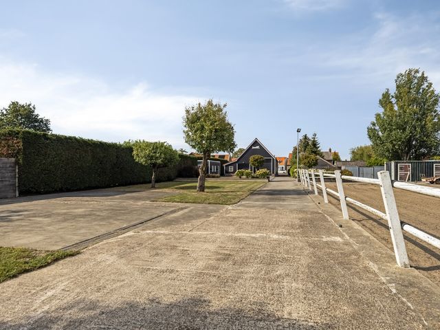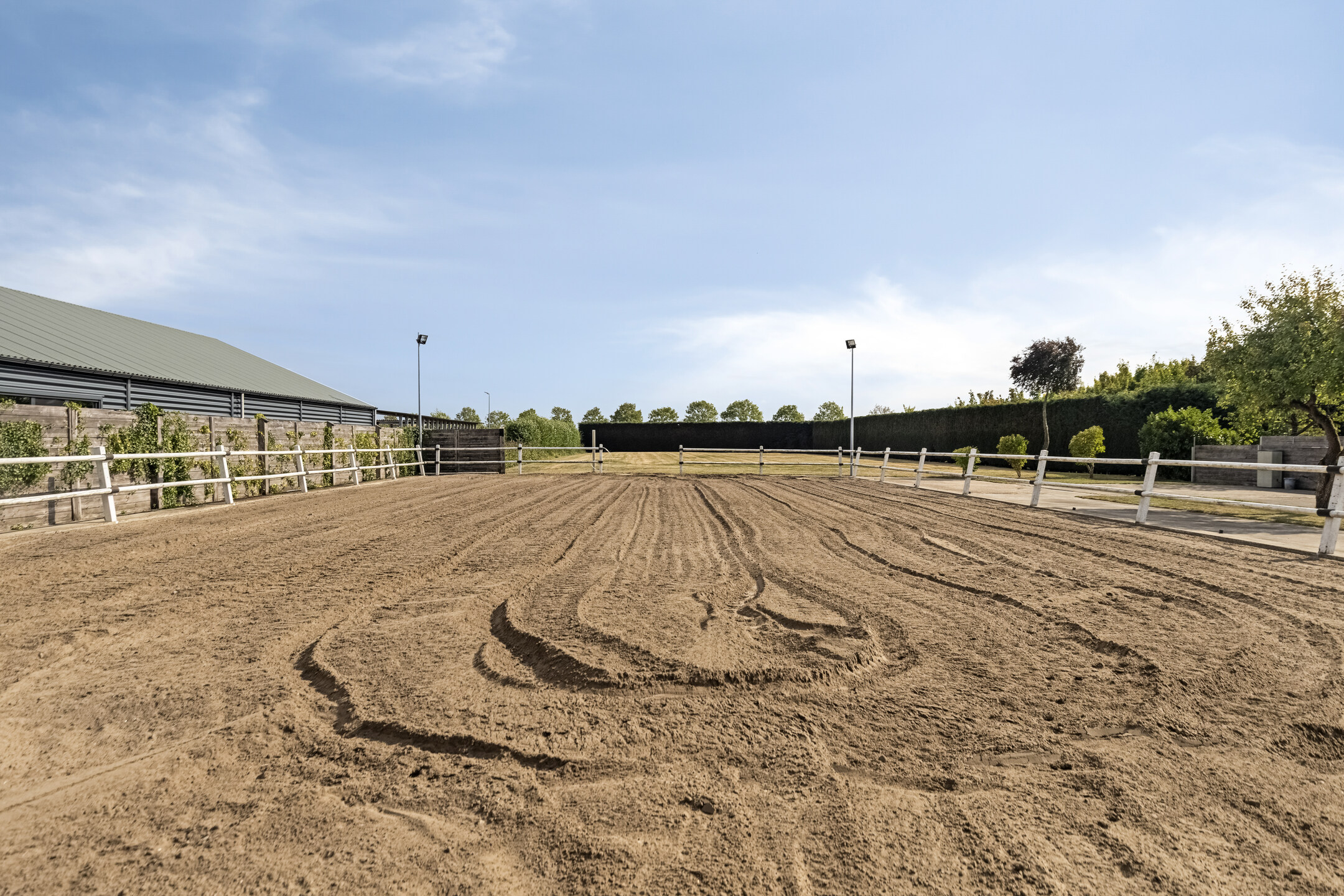 De achterzijde vormt het hart van het buitenleven; een ruim opgezet, praktisch ingericht erf dat volledig is afgestemd voor bijvoorbeeld het houden van paarden. Hier treft u onder andere een paardenbak (38 x 18,5) met zandbodem en voorzien van drainage, ideaal voor training en recreatief rijden, en direct aangrenzend diverse weilanden.