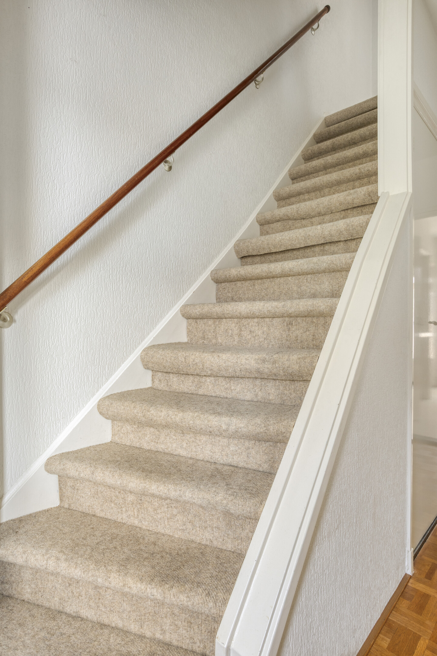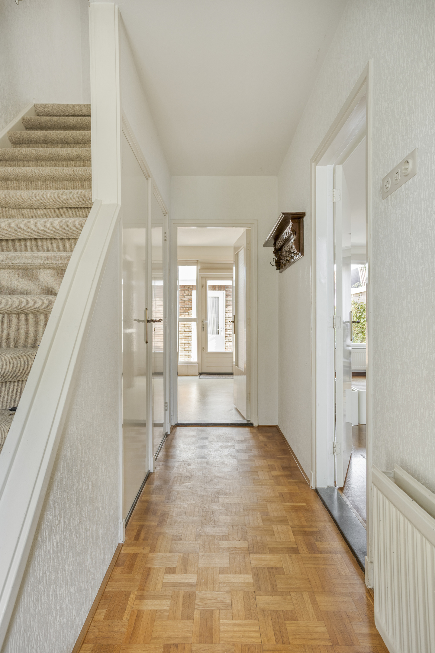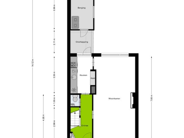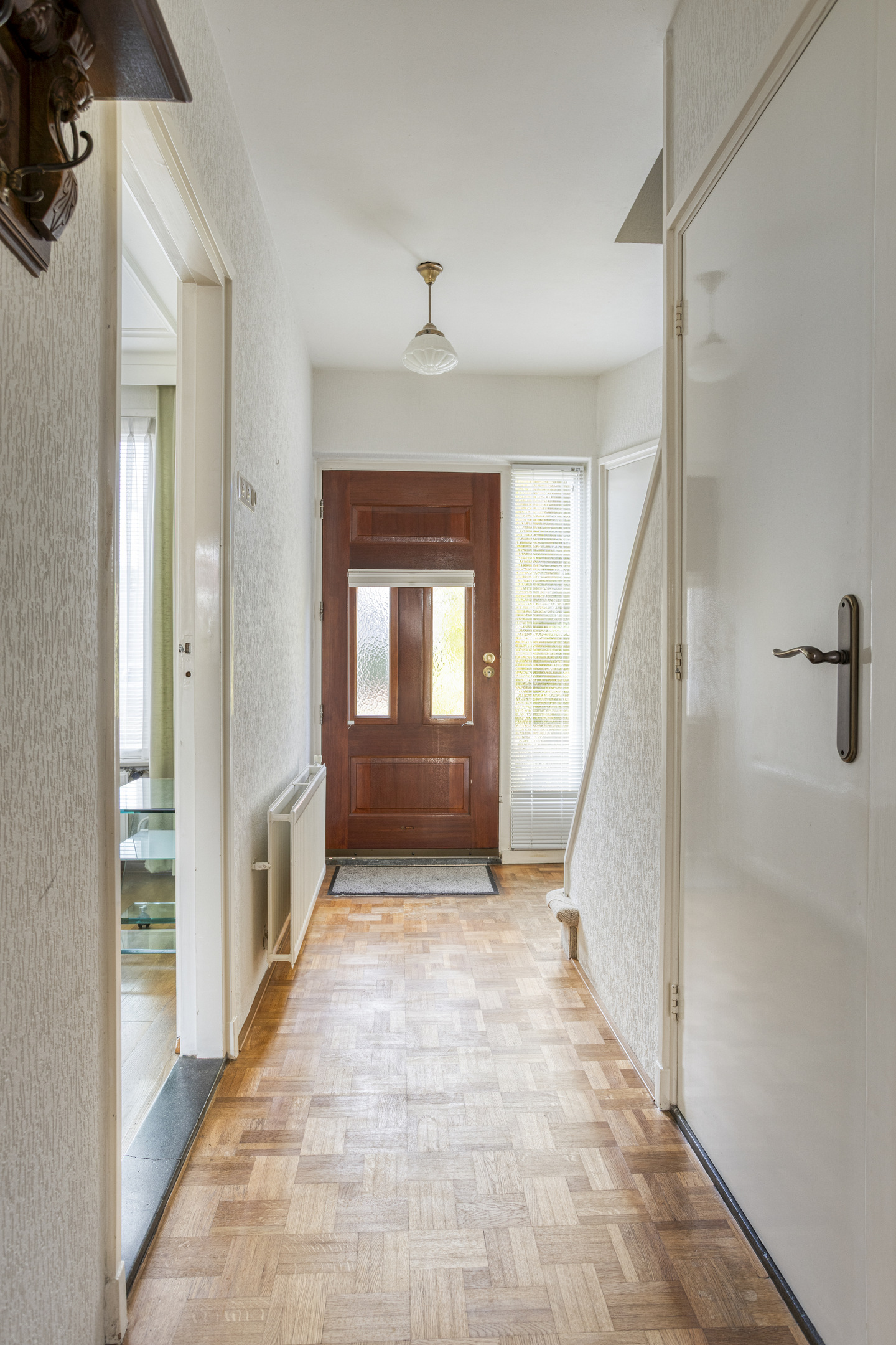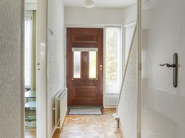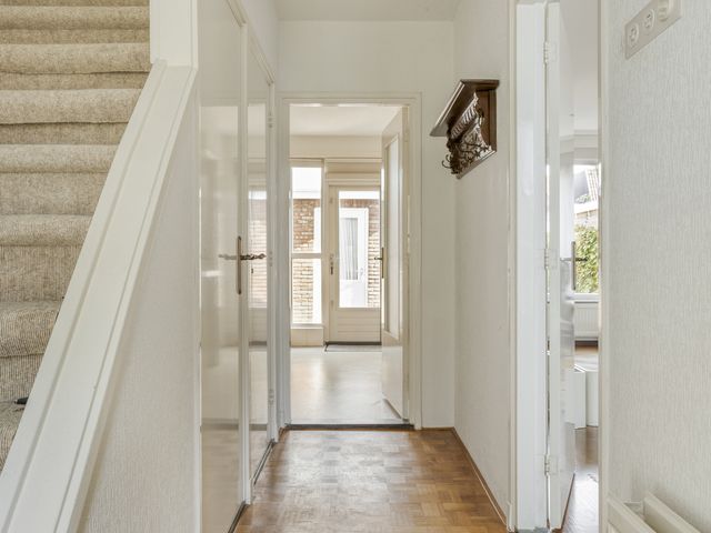 De voortuin, die is aangelegd met groen en sierlijke klinkers, leidt naar de entree van de woning. Bij binnenkomst word je verwelkomd door een ruime hal met volop ruimte voor een garderobe. Dankzij de handige trapkast kunnen jassen en schoenen netjes worden opgeborgen. Vanuit de hal heb je toegang tot de keuken, het toilet, de trapopgang en de woonkamer, wat zorgt voor een fijne en praktische indeling.