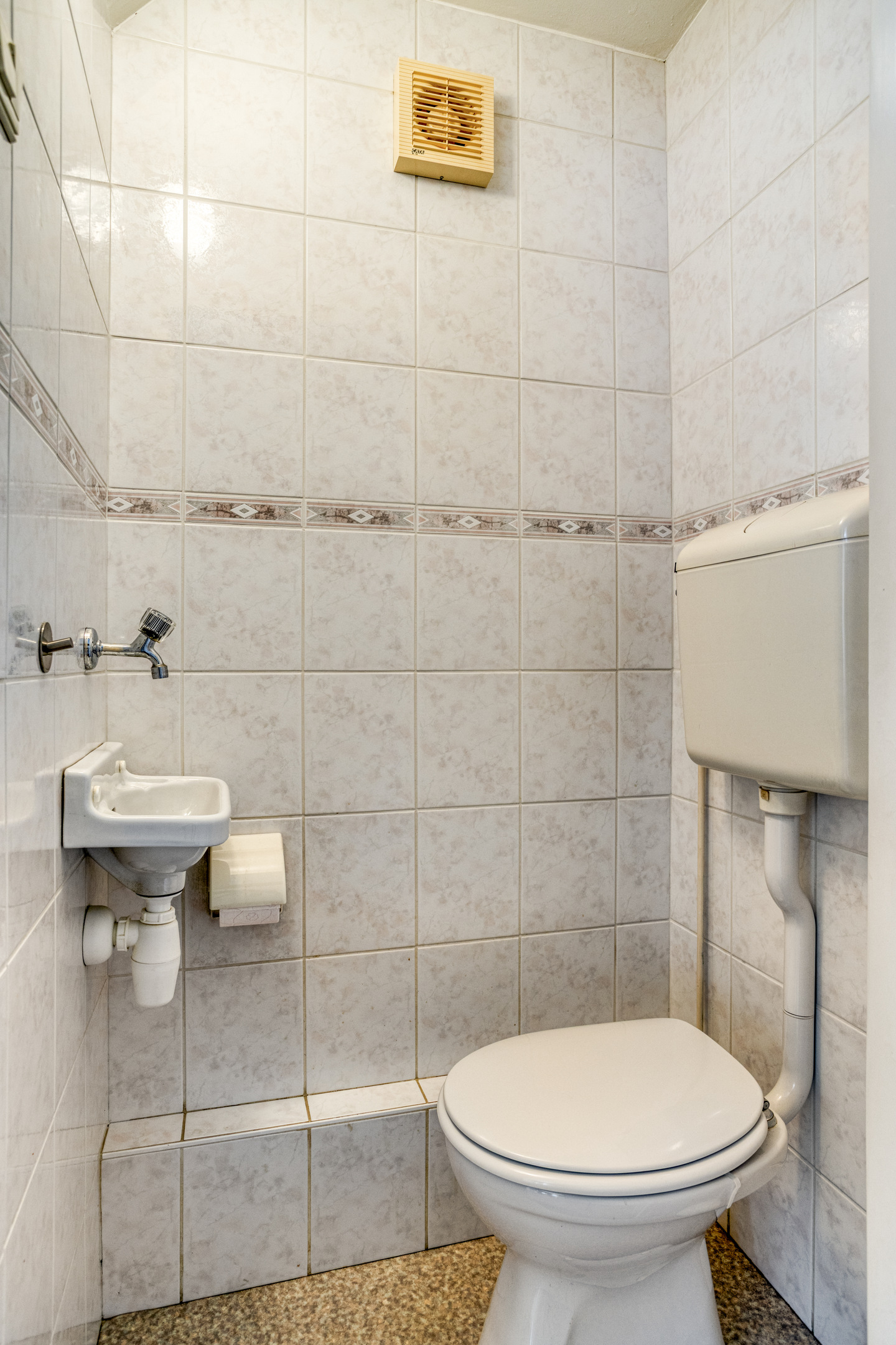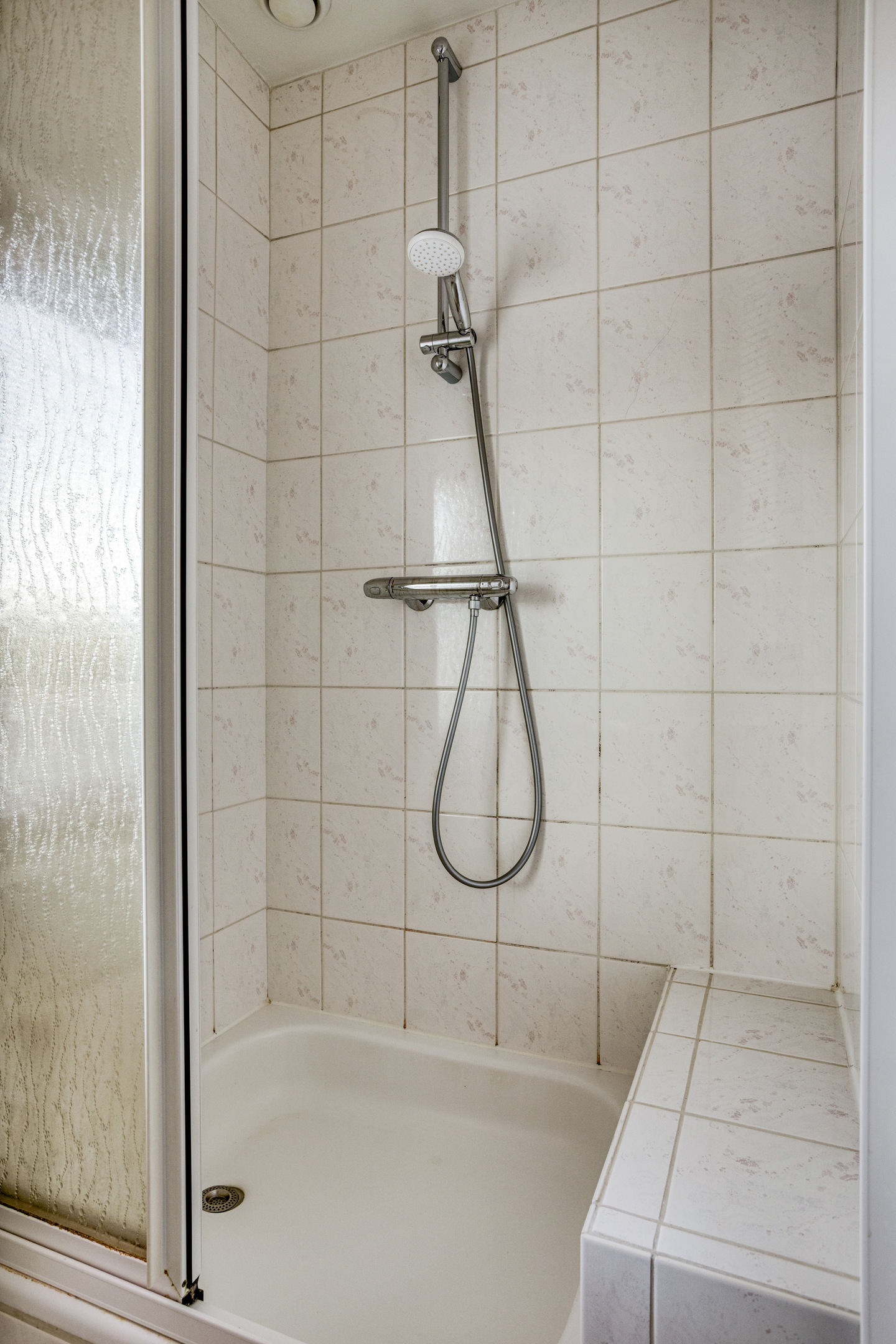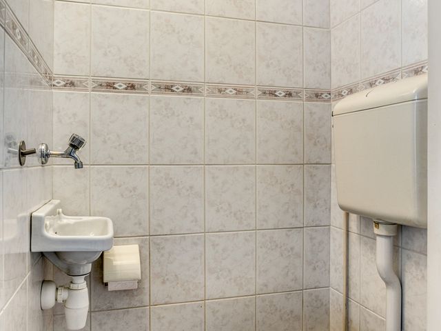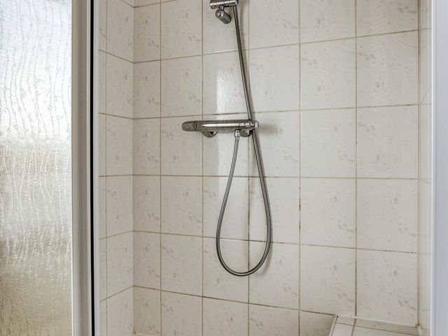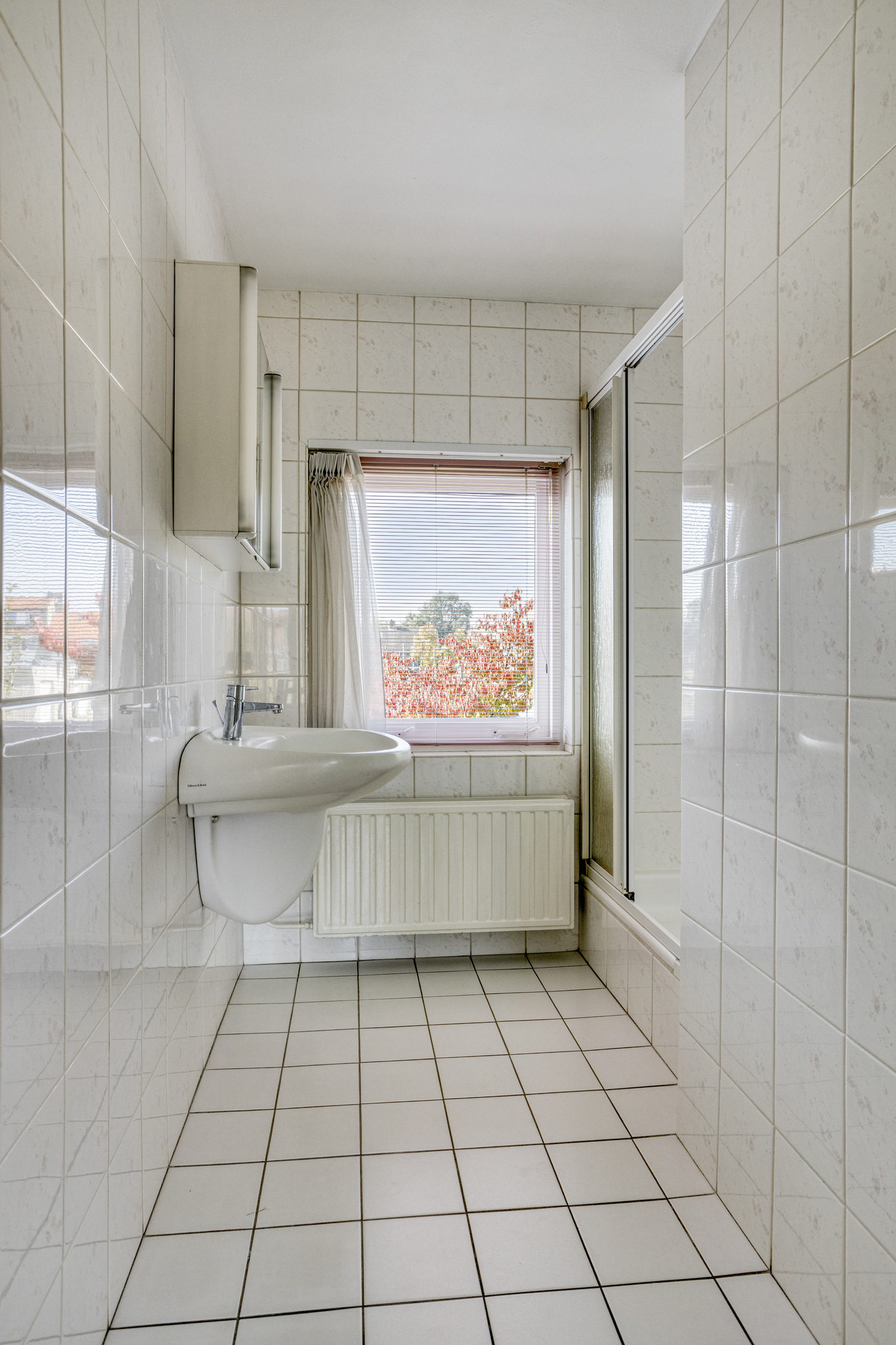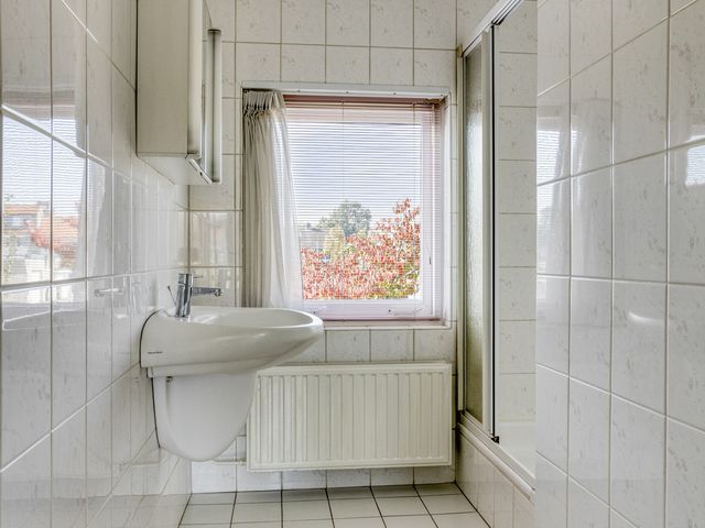 De badkamer is eenvoudig, maar volledig betegeld en voorzien van een wastafel, douche, radiator en een raam voor daglicht en ventilatie. Voor de handige klusser is dit een leuke kans om hier een moderne wellness-sfeer van te maken.