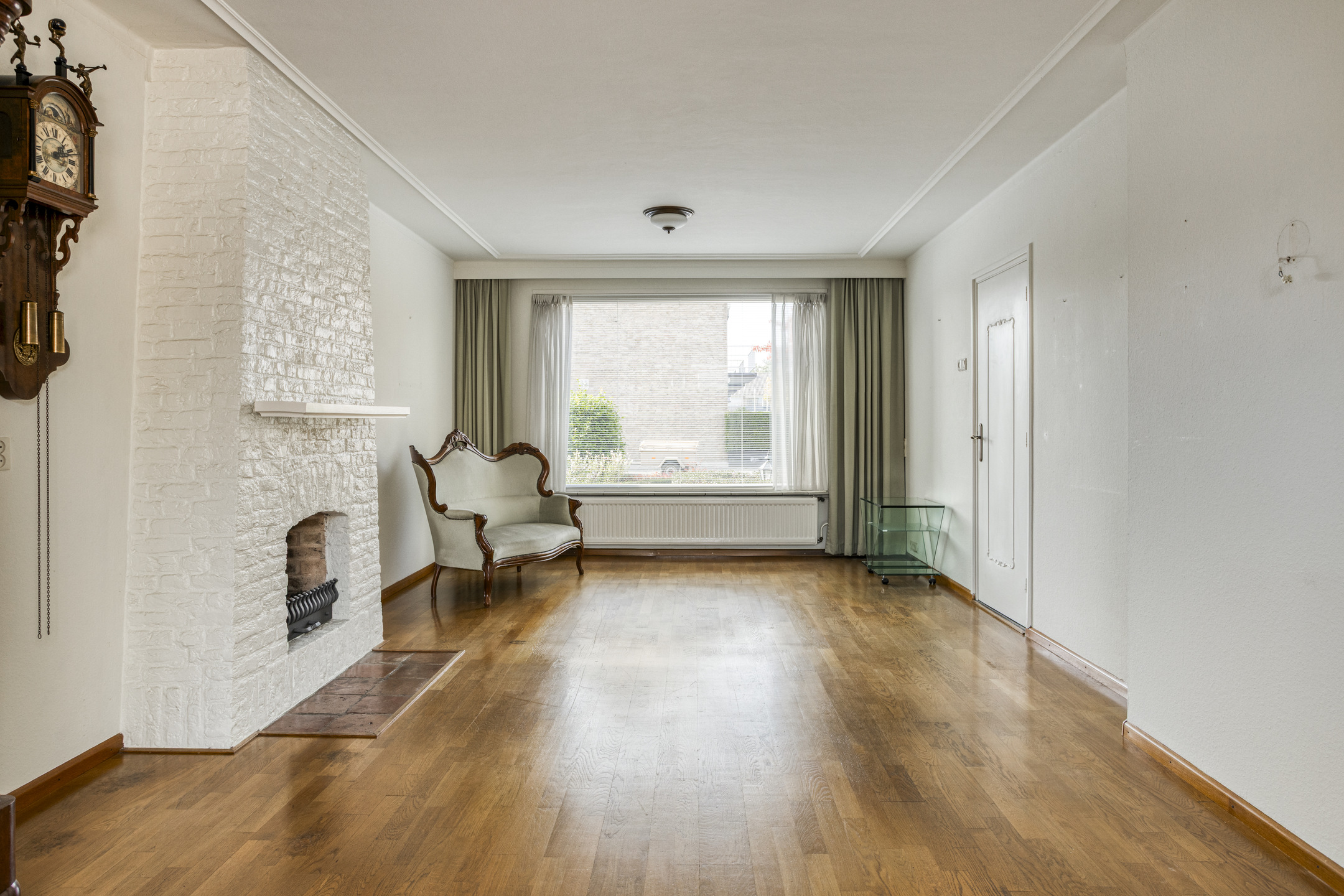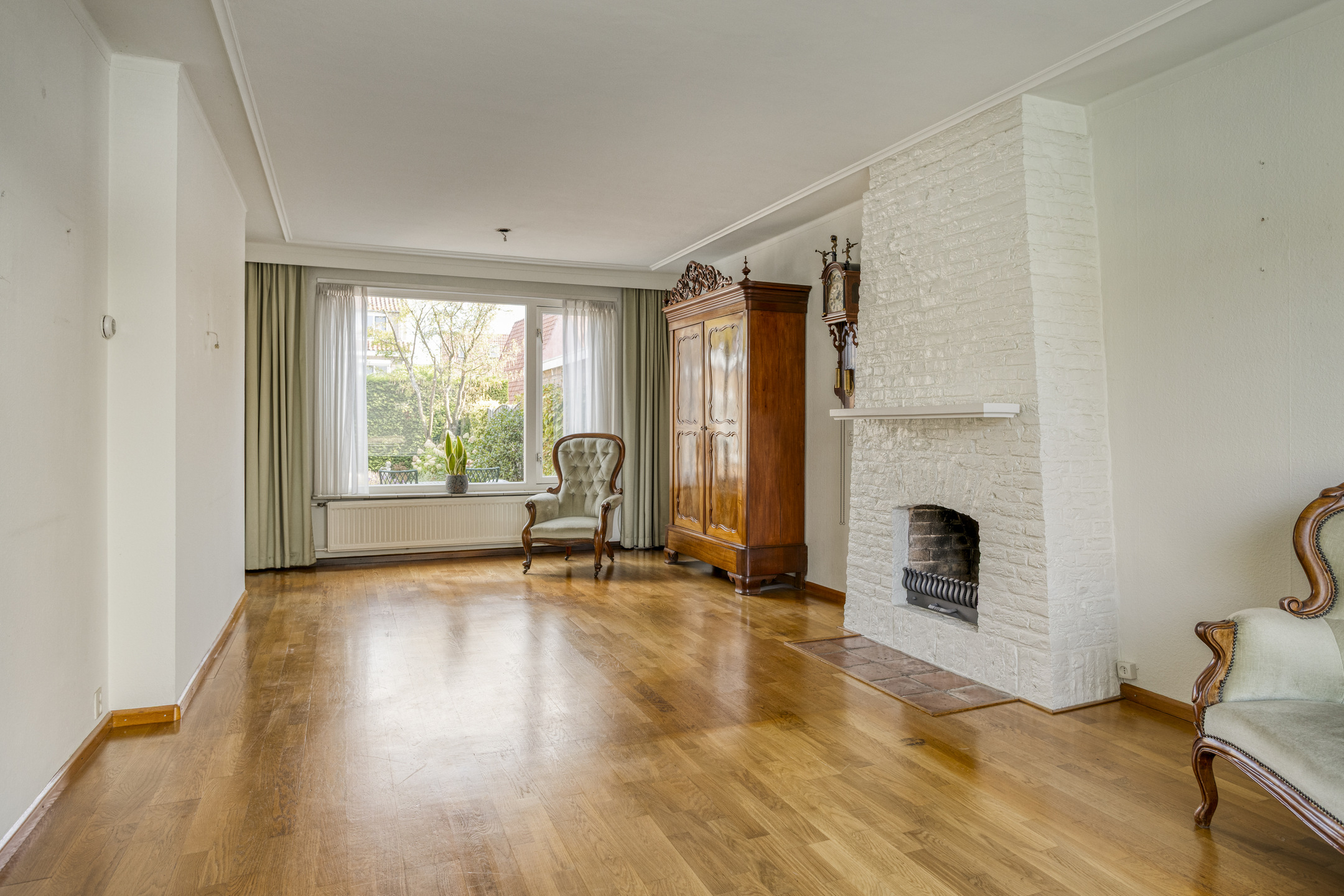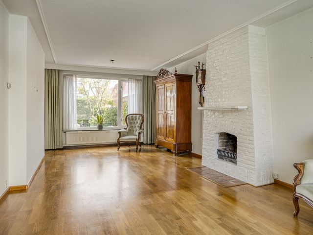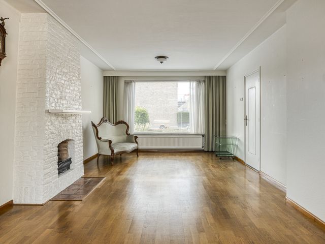 De lichte doorzonwoonkamer is ruim en biedt volop mogelijkheden voor een gezellige zithoek én een riante eettafel. Aan de achterzijde biedt het raam een prachtig uitzicht op de groene tuin. De aanwezige open haard geeft extra warmte en gezelligheid, en vormt een mooie basis om de woonkamer modern en sfeervol in te richten.
