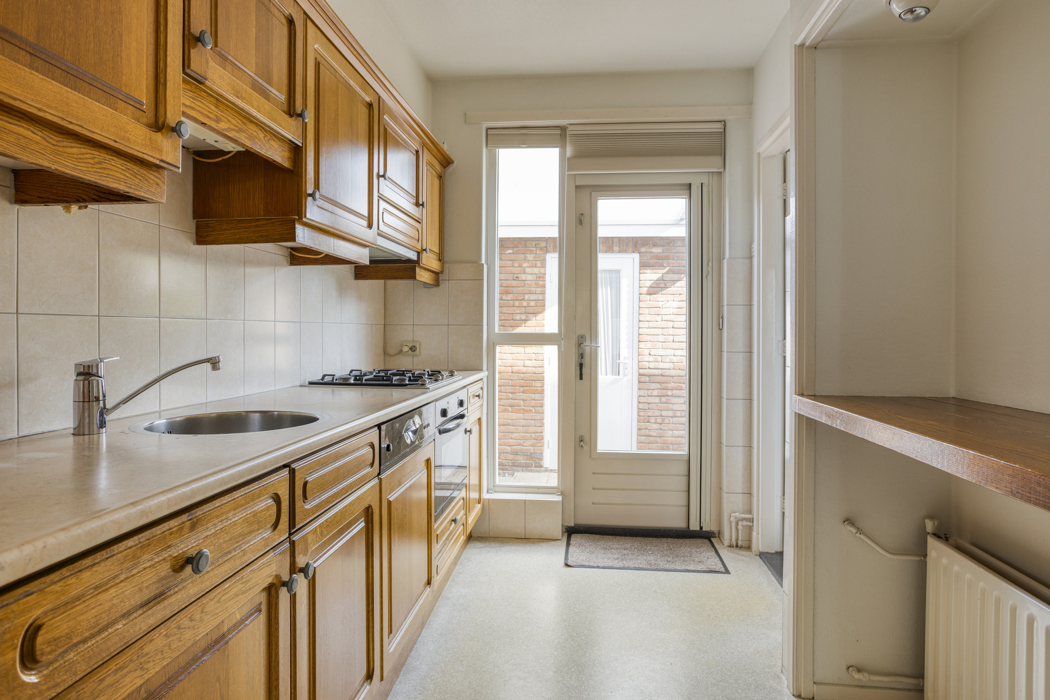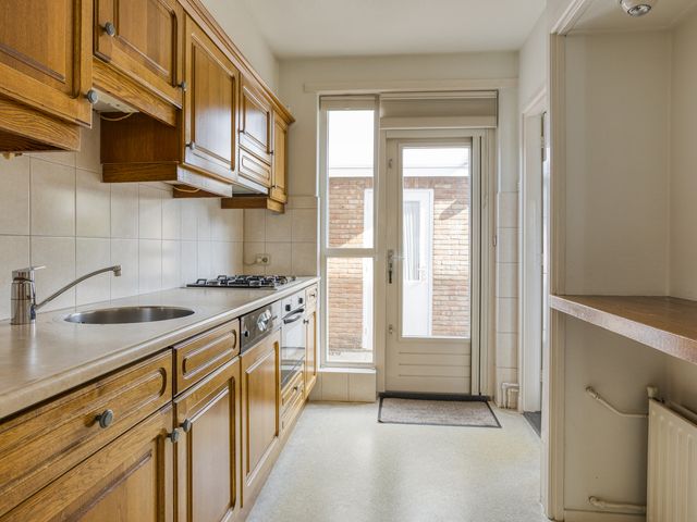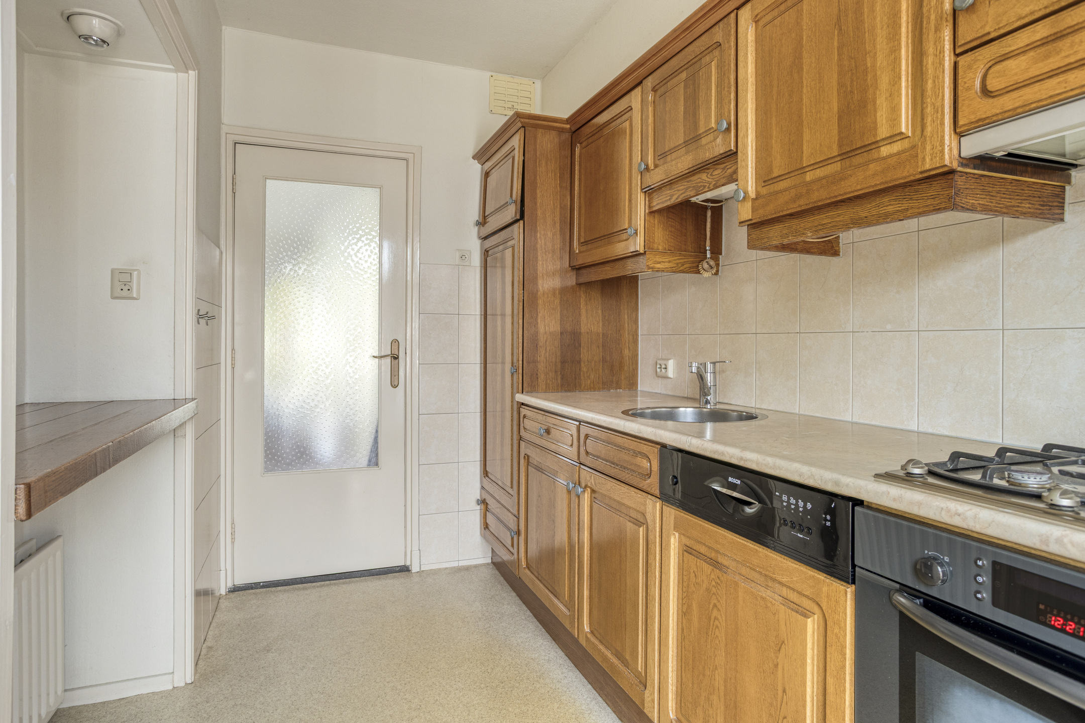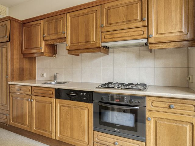 Vanuit zowel de woonkamer als de hal loop je naar de dichte keuken, die is voorzien van een lichte zeilvloer en een handig barretje voor ontbijt of koffie. De keuken beschikt over diverse kasten en laden, een oven, gasfornuis met afzuigkap, vaatwasser en spoelbak met kraan.